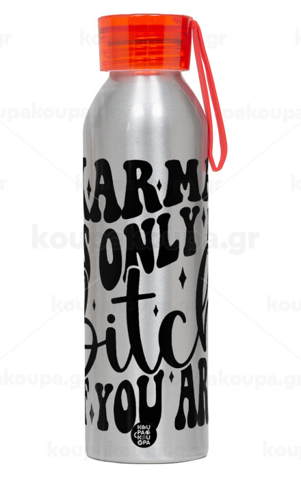 Karma is Only A Bitch if You Are, Aluminum Sports Bottle 650ml – Silver with Red Cap and Silicone Strap