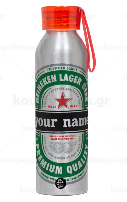 Heineken with name, Aluminum Sports Bottle 650ml – Silver with Red Cap and Silicone Strap