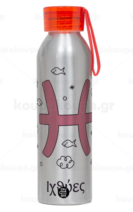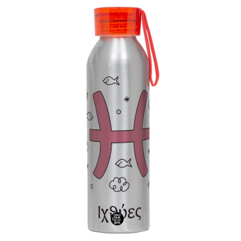 Ζώδια Ιχθύες, Aluminum Sports Bottle 650ml – Silver with Red Cap and Silicone Strap