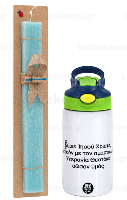 Προσευχή του Ιησού, Easter Set, Children's thermal stainless steel bottle with safety straw, green/blue (350ml) & aromatic flat Easter candle (30cm) (TURQUOISE)
