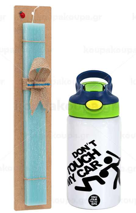 Don't touch my car, Easter Set, Children's thermal stainless steel bottle with safety straw, green/blue (350ml) & aromatic flat Easter candle (30cm) (TURQUOISE)