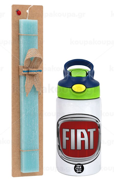 FIAT, Easter Set, Children's thermal stainless steel bottle with safety straw, green/blue (350ml) & aromatic flat Easter candle (30cm) (TURQUOISE)