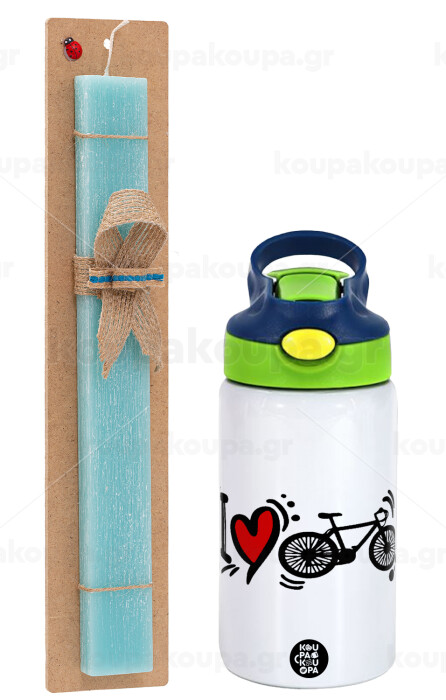 I love my bike, Easter Set, Children's thermal stainless steel bottle with safety straw, green/blue (350ml) & aromatic flat Easter candle (30cm) (TURQUOISE)