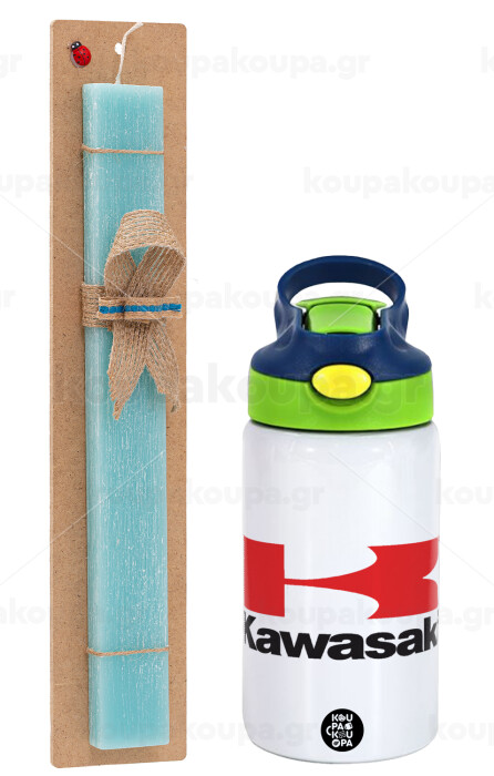 Kawasaki, Easter Set, Children's thermal stainless steel bottle with safety straw, green/blue (350ml) & aromatic flat Easter candle (30cm) (TURQUOISE)
