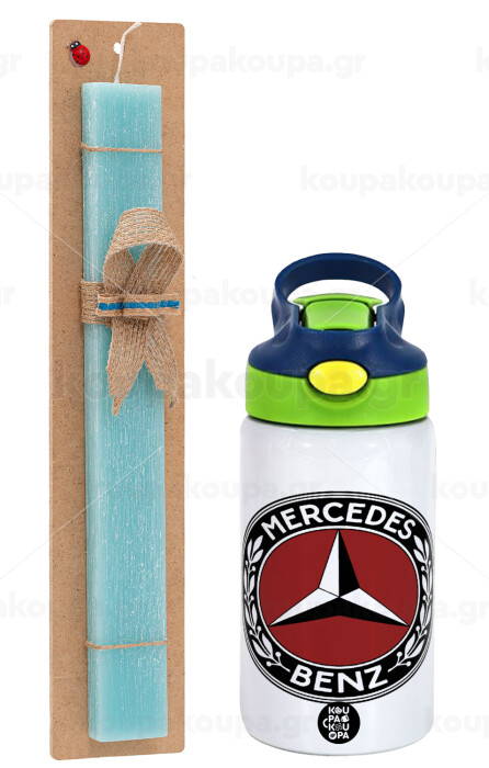 Mercedes vintage, Easter Set, Children's thermal stainless steel bottle with safety straw, green/blue (350ml) & aromatic flat Easter candle (30cm) (TURQUOISE)
