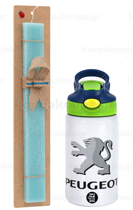 Peugeot, Easter Set, Children's thermal stainless steel bottle with safety straw, green/blue (350ml) & aromatic flat Easter candle (30cm) (TURQUOISE)