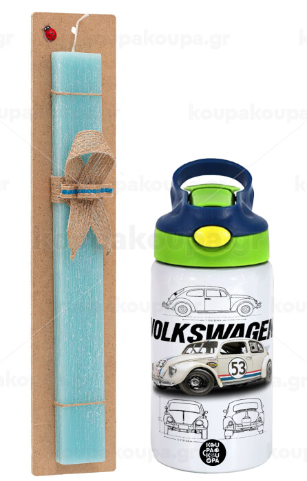Volkswagen Beetle, Easter Set, Children's thermal stainless steel bottle with safety straw, green/blue (350ml) & aromatic flat Easter candle (30cm) (TURQUOISE)