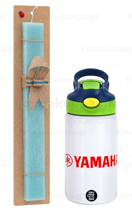 Yamaha, Easter Set, Children's thermal stainless steel bottle with safety straw, green/blue (350ml) & aromatic flat Easter candle (30cm) (TURQUOISE)