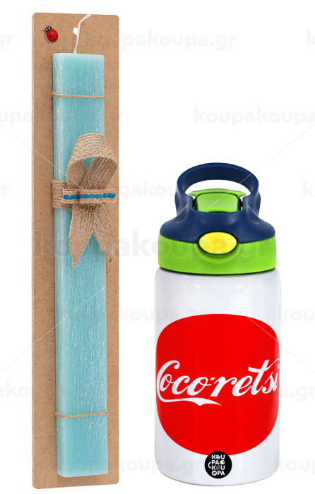 Cocoretsi, Easter Set, Children's thermal stainless steel bottle with safety straw, green/blue (350ml) & aromatic flat Easter candle (30cm) (TURQUOISE)