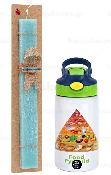 Food pyramid chart, Easter Set, Children's thermal stainless steel bottle with safety straw, green/blue (350ml) & aromatic flat Easter candle (30cm) (TURQUOISE)