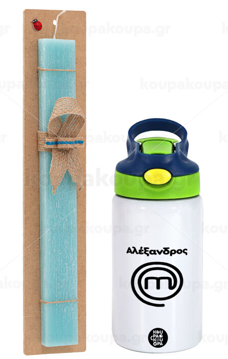 Master Chef Greece, Easter Set, Children's thermal stainless steel bottle with safety straw, green/blue (350ml) & aromatic flat Easter candle (30cm) (TURQUOISE)