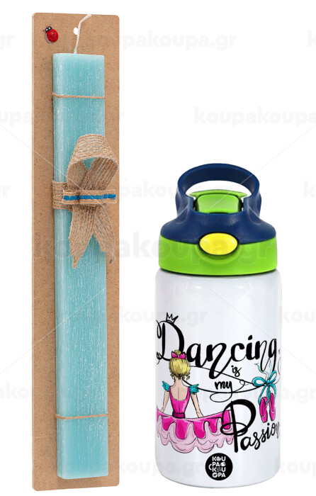 Dancing is my Passion, Easter Set, Children's thermal stainless steel bottle with safety straw, green/blue (350ml) & aromatic flat Easter candle (30cm) (TURQUOISE)