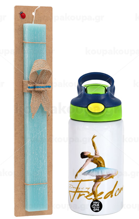 Gold Dancer, Easter Set, Children's thermal stainless steel bottle with safety straw, green/blue (350ml) & aromatic flat Easter candle (30cm) (TURQUOISE)