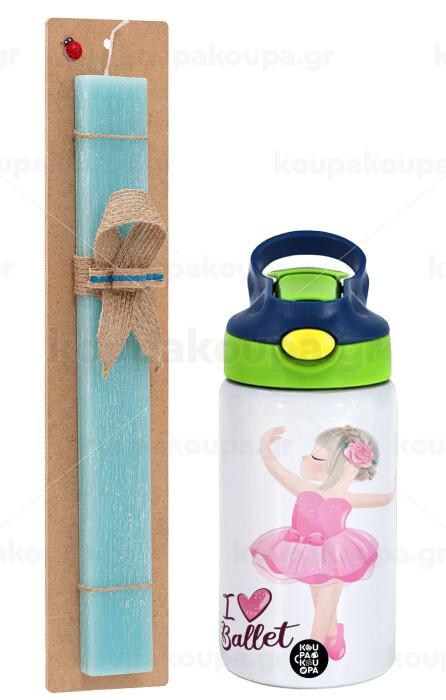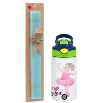 I Love Ballet, Easter Set, Children's thermal stainless steel bottle with safety straw, green/blue (350ml) & aromatic flat Easter candle (30cm) (TURQUOISE)