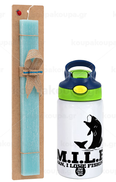M.I.L.F. Mam i love fishing, Easter Set, Children's thermal stainless steel bottle with safety straw, green/blue (350ml) & aromatic flat Easter candle (30cm) (TURQUOISE)