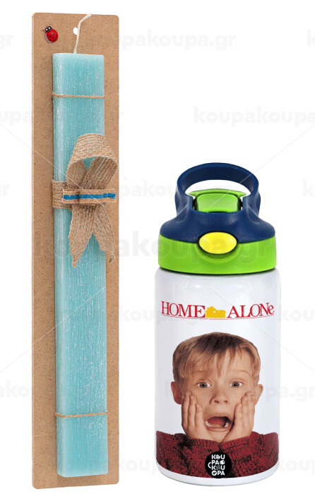 Μόνος στο σπίτι Kevin McCallister Shocked, Easter Set, Children's thermal stainless steel bottle with safety straw, green/blue (350ml) & aromatic flat Easter candle (30cm) (TURQUOISE)