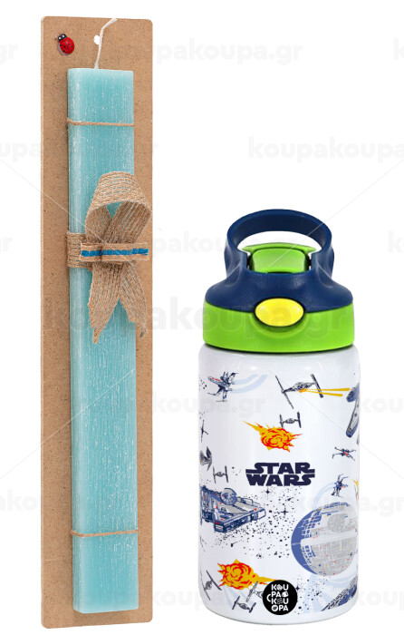 Star wars drawing, Easter Set, Children's thermal stainless steel bottle with safety straw, green/blue (350ml) & aromatic flat Easter candle (30cm) (TURQUOISE)