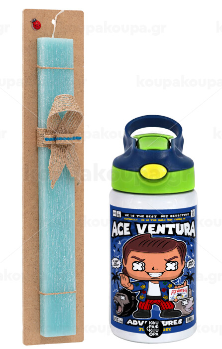Ace Ventura: Pet Detective, Easter Set, Children's thermal stainless steel bottle with safety straw, green/blue (350ml) & aromatic flat Easter candle (30cm) (TURQUOISE)
