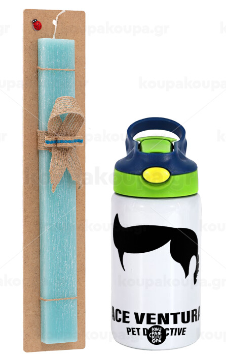 Ace Ventura Pet Detective, Easter Set, Children's thermal stainless steel bottle with safety straw, green/blue (350ml) & aromatic flat Easter candle (30cm) (TURQUOISE)