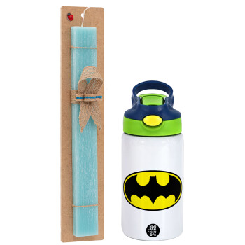 Batman, Easter Set, Children's thermal stainless steel bottle with safety straw, green/blue (350ml) & aromatic flat Easter candle (30cm) (TURQUOISE)