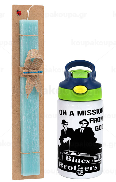 Blues brothers on a mission from God, Easter Set, Children's thermal stainless steel bottle with safety straw, green/blue (350ml) & aromatic flat Easter candle (30cm) (TURQUOISE)