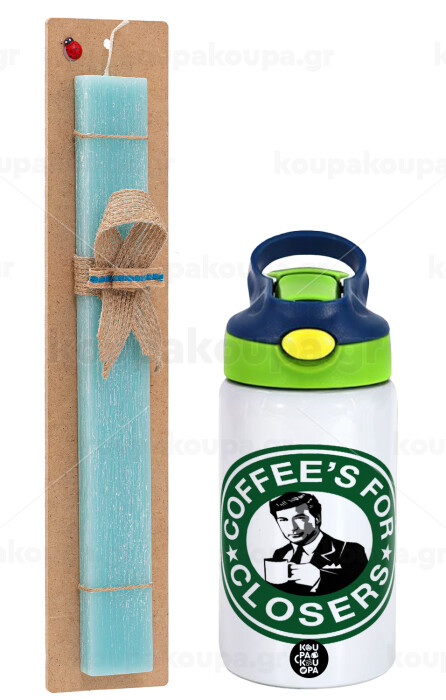 Coffee's for closers, Easter Set, Children's thermal stainless steel bottle with safety straw, green/blue (350ml) & aromatic flat Easter candle (30cm) (TURQUOISE)