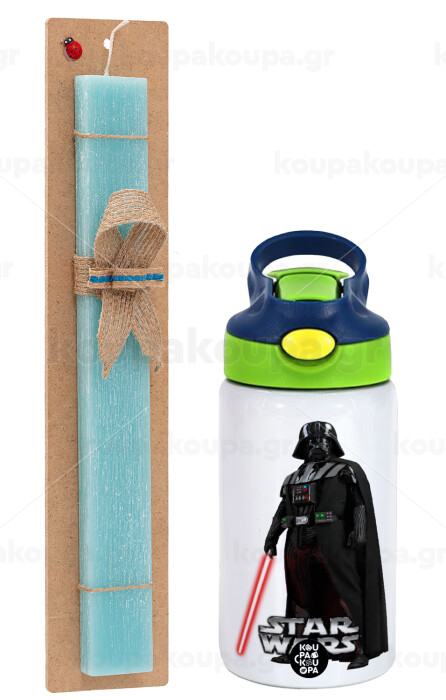 Darth vader, Easter Set, Children's thermal stainless steel bottle with safety straw, green/blue (350ml) & aromatic flat Easter candle (30cm) (TURQUOISE)