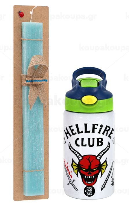 Hellfire CLub, Stranger Things, Easter Set, Children's thermal stainless steel bottle with safety straw, green/blue (350ml) & aromatic flat Easter candle (30cm) (TURQUOISE)