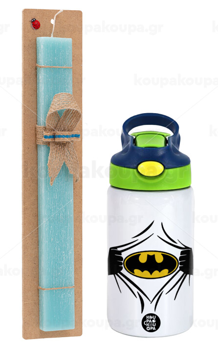 Hero batman, Easter Set, Children's thermal stainless steel bottle with safety straw, green/blue (350ml) & aromatic flat Easter candle (30cm) (TURQUOISE)