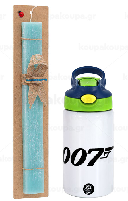 James Bond 007, Easter Set, Children's thermal stainless steel bottle with safety straw, green/blue (350ml) & aromatic flat Easter candle (30cm) (TURQUOISE)
