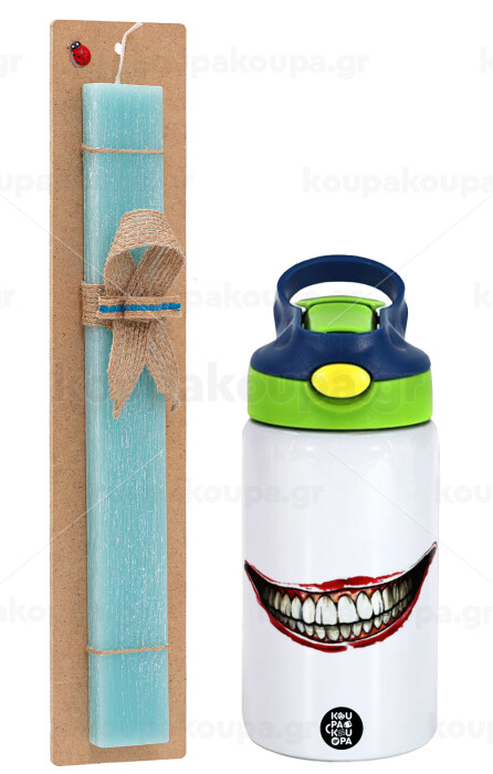 Joker smile, Easter Set, Children's thermal stainless steel bottle with safety straw, green/blue (350ml) & aromatic flat Easter candle (30cm) (TURQUOISE)