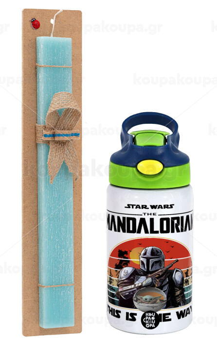 Mandalorian, Easter Set, Children's thermal stainless steel bottle with safety straw, green/blue (350ml) & aromatic flat Easter candle (30cm) (TURQUOISE)