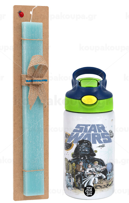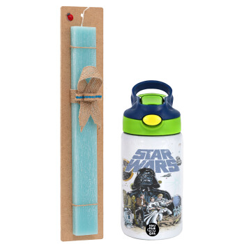 Star Wars, Easter Set, Children's thermal stainless steel bottle with safety straw, green/blue (350ml) & aromatic flat Easter candle (30cm) (TURQUOISE)