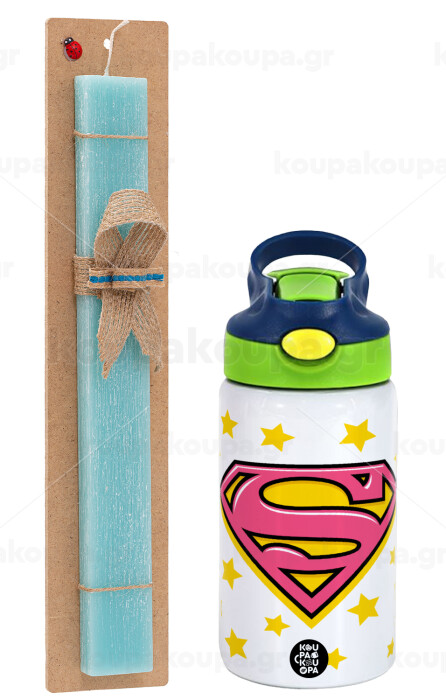 Superman Pink, Easter Set, Children's thermal stainless steel bottle with safety straw, green/blue (350ml) & aromatic flat Easter candle (30cm) (TURQUOISE)