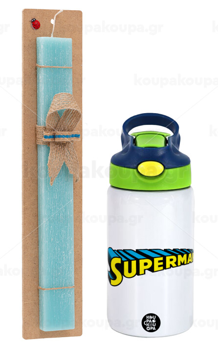 Superman vintage, Easter Set, Children's thermal stainless steel bottle with safety straw, green/blue (350ml) & aromatic flat Easter candle (30cm) (TURQUOISE)