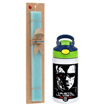 Terminator Hasta La Vista, Easter Set, Children's thermal stainless steel bottle with safety straw, green/blue (350ml) & aromatic flat Easter candle (30cm) (TURQUOISE)