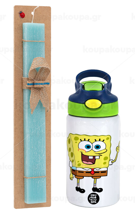 SpongeBob SquarePants character, Easter Set, Children's thermal stainless steel bottle with safety straw, green/blue (350ml) & aromatic flat Easter candle (30cm) (TURQUOISE)