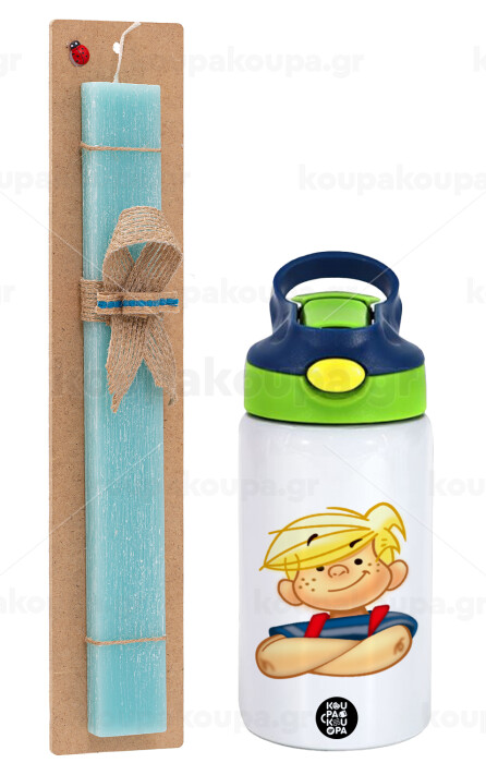Dennis the Menace, Easter Set, Children's thermal stainless steel bottle with safety straw, green/blue (350ml) & aromatic flat Easter candle (30cm) (TURQUOISE)