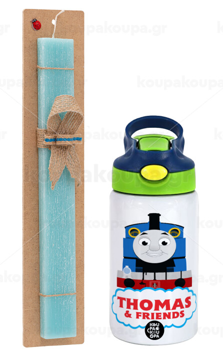 Τόμας το τρενάκι, Easter Set, Children's thermal stainless steel bottle with safety straw, green/blue (350ml) & aromatic flat Easter candle (30cm) (TURQUOISE)