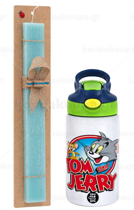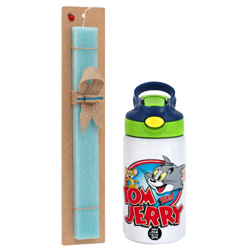 Tom and Jerry, Easter Set, Children's thermal stainless steel bottle with safety straw, green/blue (350ml) & aromatic flat Easter candle (30cm) (TURQUOISE)