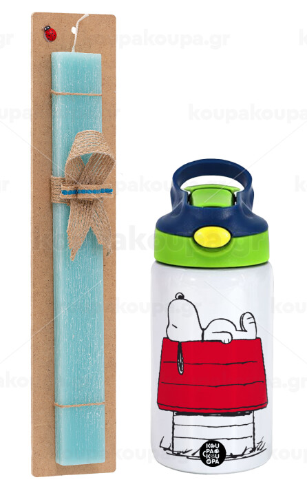 Το σπίτι του snoopy, Easter Set, Children's thermal stainless steel bottle with safety straw, green/blue (350ml) & aromatic flat Easter candle (30cm) (TURQUOISE)