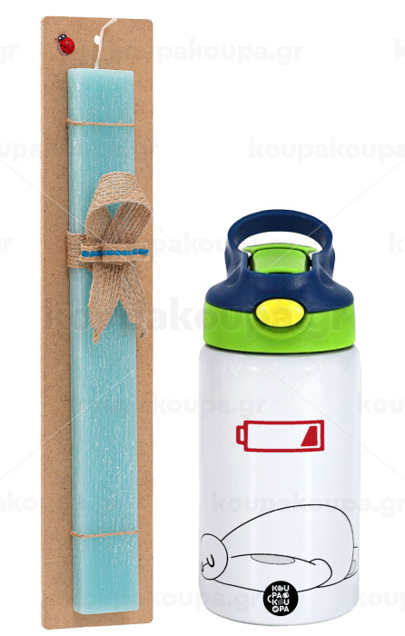 Baymax battery low, Easter Set, Children's thermal stainless steel bottle with safety straw, green/blue (350ml) & aromatic flat Easter candle (30cm) (TURQUOISE)