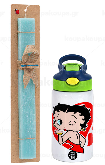 Betty Boop, Easter Set, Children's thermal stainless steel bottle with safety straw, green/blue (350ml) & aromatic flat Easter candle (30cm) (TURQUOISE)