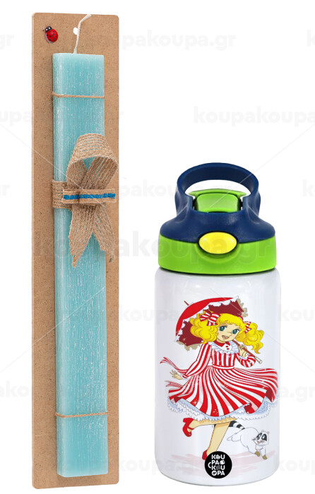Candy, Easter Set, Children's thermal stainless steel bottle with safety straw, green/blue (350ml) & aromatic flat Easter candle (30cm) (TURQUOISE)