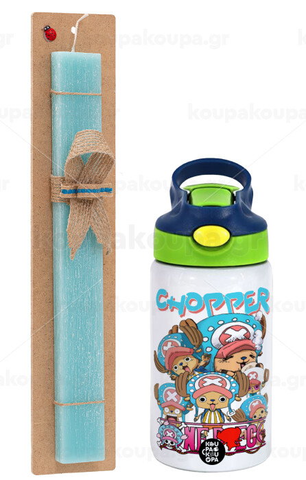 Chopper One Piece, Easter Set, Children's thermal stainless steel bottle with safety straw, green/blue (350ml) & aromatic flat Easter candle (30cm) (TURQUOISE)