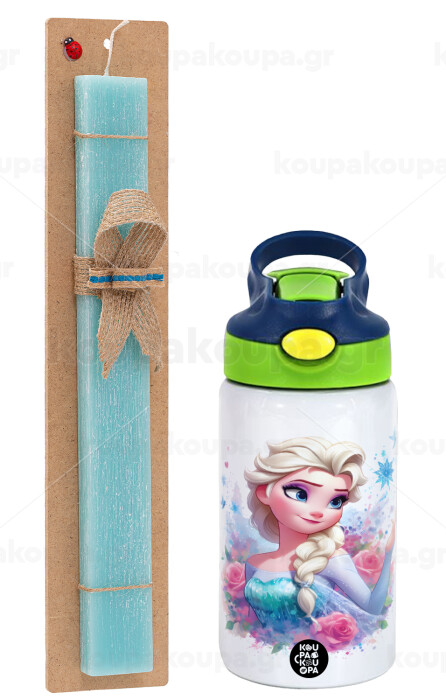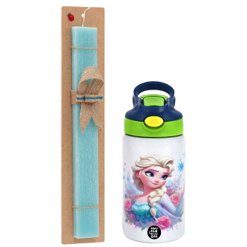 Elsa Princess, Easter Set, Children's thermal stainless steel bottle with safety straw, green/blue (350ml) & aromatic flat Easter candle (30cm) (TURQUOISE)