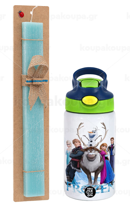 Frozen, Easter Set, Children's thermal stainless steel bottle with safety straw, green/blue (350ml) & aromatic flat Easter candle (30cm) (TURQUOISE)