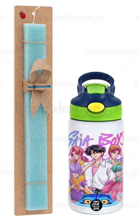 Huntrix Saja Boys, Easter Set, Children's thermal stainless steel bottle with safety straw, green/blue (350ml) & aromatic flat Easter candle (30cm) (TURQUOISE)