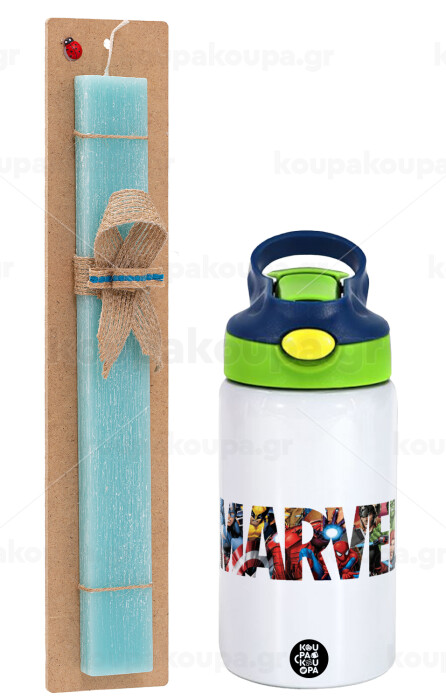 MARVEL characters, Easter Set, Children's thermal stainless steel bottle with safety straw, green/blue (350ml) & aromatic flat Easter candle (30cm) (TURQUOISE)