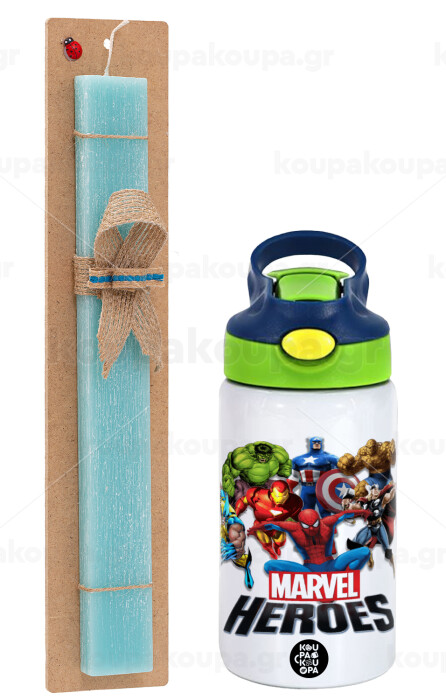 MARVEL heroes, Easter Set, Children's thermal stainless steel bottle with safety straw, green/blue (350ml) & aromatic flat Easter candle (30cm) (TURQUOISE)